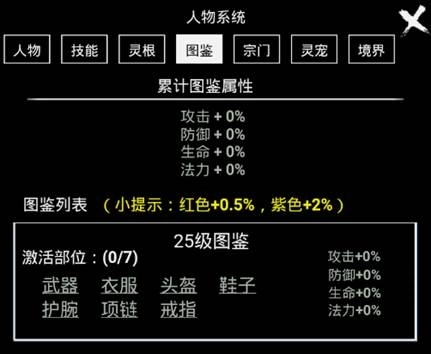 人物面板包含人物属性、技能、灵根、图鉴、宗门、宠物、境界这七个部分。
