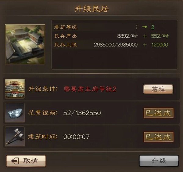 为什么要把银矿和民居放在一块儿说呢?因为这俩建筑的功能其实挺相似的——银矿负责产出银子,民居负责产出民兵,而且它们的产出都很稳定。不管你是喜欢安安稳稳种田,还是偏爱掠夺他人这种侵略性玩法,银矿和民居都得尽量升满才行。要是你想追求极限收益,就得尽可能让矿稿和征兵令的增益状态一直保持着,毕竟这俩道具能直接提升银矿和民居的基础产量,关键是它们不仅便宜,参加活动也能轻松获取到。