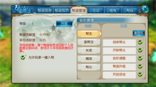 - 会阶管理:对帮派内的会阶体系进行管理;