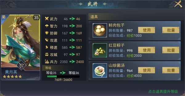 武将等级最高级为50级。通过攻打【资源地】,【野怪】,【山寨】等出征方式来获得武将经验,也可以通过使用【经验道具】快速提升武将等级。