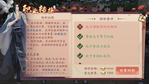 3、先查看界面里的转职条件是否符合要求,若满足条件,就需要消耗相应数量的元宝(首次转职能享受折扣优惠,之后再转职则会恢复正常的元宝消耗),然后就可以选择“我要转职”选项了。