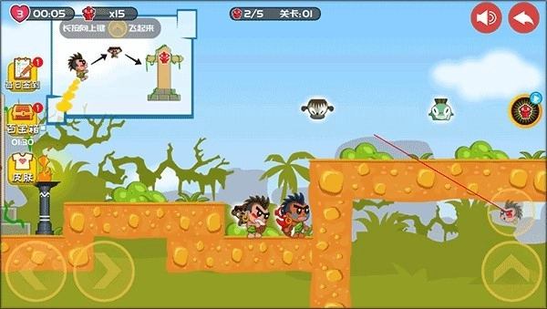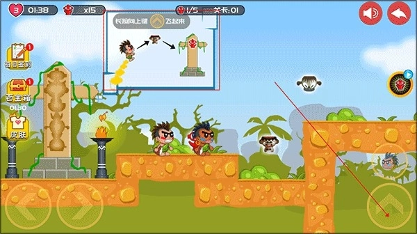 1、安装好屁王兄弟双人版,进入游戏,长按如图所示的键可以让角色飞起来。