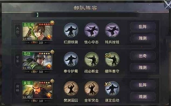 前锋:关羽(战法配置:全军突击与XP谋定后动;乱阵和难测)
