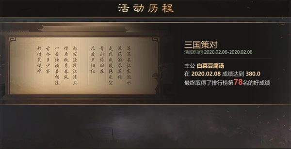 个人征程界面将新增“活动历程”入口,点击该入口即可查看活动相关的历史记录。活动历程会记录主公参与过且有排行榜排名记录的活动。