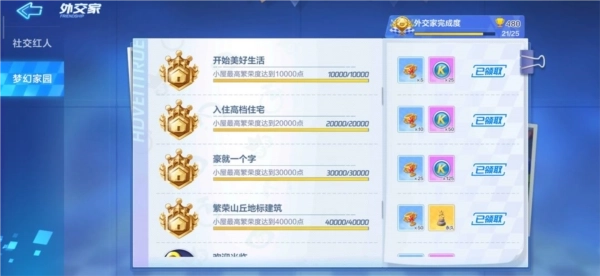 关于小屋繁荣度的提升,你可以用酷币购买紫色幸运币包,然后全部开启巴黎风情系列的。等幸运值攒满后,第一次会出背景,之后再开就都是兑换券了。攒够18张兑换券就能换来玩鸭,家园币则可以用来兑换彩绳气球。另外,用橙色幸运币开滨海风景背景也能增加繁荣度,这样算下来,达到40000繁荣度其实并不难。