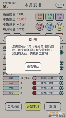 开始了日复一日“打零工、吃饭、睡觉、偿还债务”的循环生活;玩家不仅要承担自身的日常开销,还会受到家庭因素的影响,需要应对家里出现的各种生活压力。