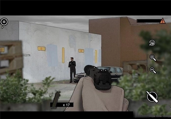 任务玩法:因为任务的特殊性,所以此关卡将孤狼的武器换成了手枪。使用手枪需要注意一点,如果你采取的是左屏幕瞄准的操作方法,那么需要左手指按住屏幕不松进行瞄准,一旦松手会被系统判定自动放弃瞄准。手枪的弹夹是17发子弹,玩家可以在敌人更迭的间歇期或者敌人较少时换子弹,弹夹打空也能自动填弹,只不过如果敌人数量较多的话,临时换弹会有点来不及。