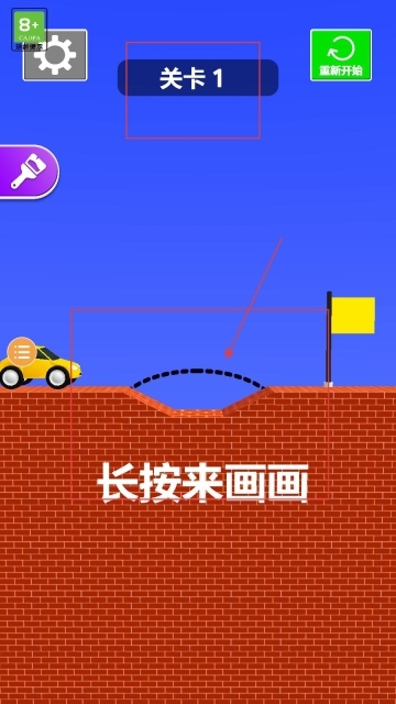 游戏开始时,玩家处于关卡1,需按照界面提示长按屏幕绘制路径,帮助黄色小车抵达黄色旗帜所在位置。