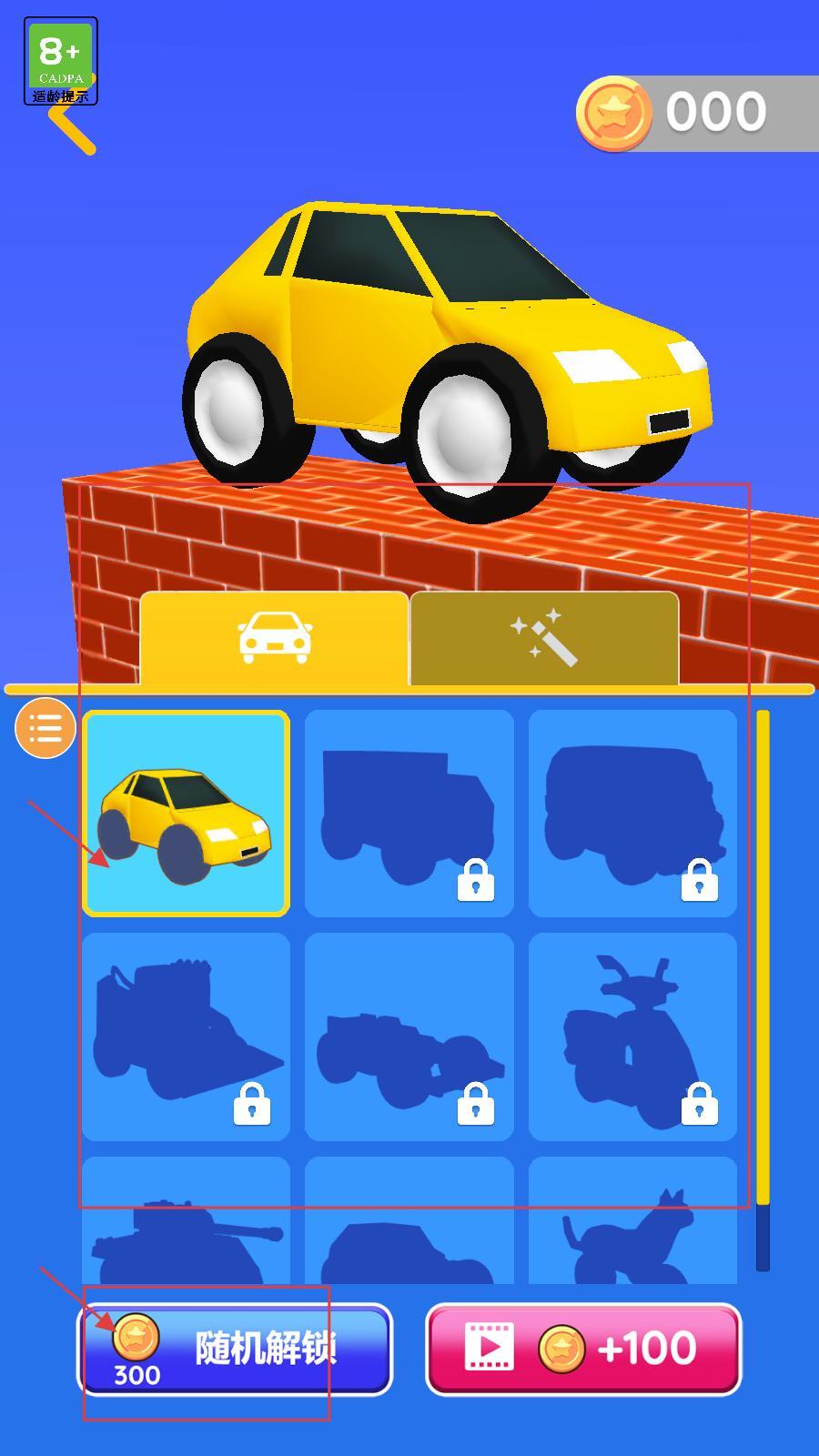 2、进入车辆选择界面后,初始状态下仅有黄色小车可供使用;若想解锁其他车辆,需消耗300金币进行随机解锁操作,因此玩家需要通过获取金币来达成解锁其他车辆的目的。
