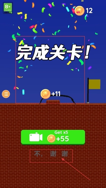 4、通过关卡后,界面会显示关卡完成的提示,同时会有金币奖励可领取,玩家点击屏幕下方的按钮就能直接获取该奖励。