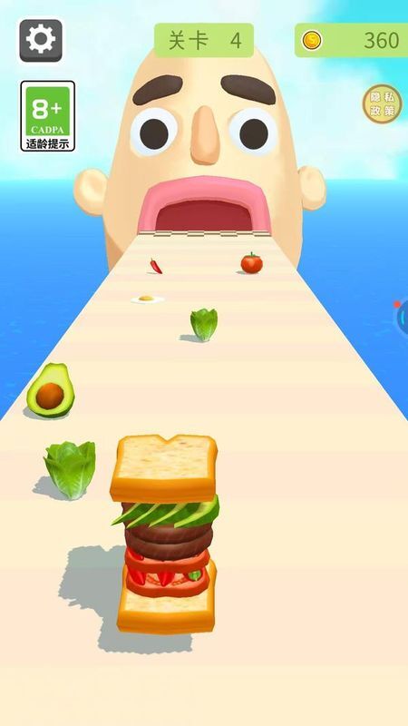 汉堡堆叠挑战:每次成功接住一种食材,汉堡的层数就会增加,你得维持好平衡,防止它倒塌。