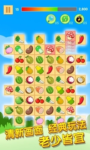 1、经典的连连看模式,玩家将相同的水果连接消除就可以了。