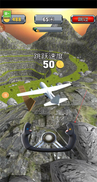 2、操控飞机推进,当行进到65米位置时,注意界面上出现的跳跃速度50提示,借助底部手柄进行操作,使飞机顺利越过障碍。