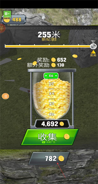 4、飞机攀升至255米,成功刷新纪录。此时可查看界面所展示的奖励详情,点击收集按钮即可领取奖励,也可选择对应的金币选项。