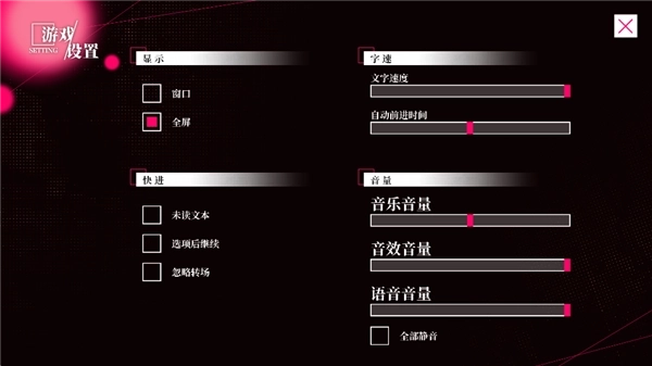 1、第一次进入游戏时,建议先点击主界面的【设置】选项,按照个人习惯调整音量、文字速度、自动播放等参数,这样能获得更舒适的游玩体验。