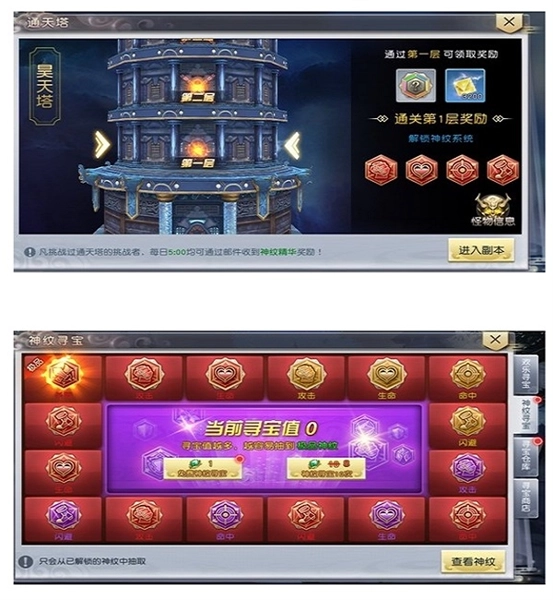 4、神纹主要可通过挑战通天塔获得。通天塔传闻为神王夏皇云天以神纹建造,挑战通天塔即可获得神纹奖励!挑战通天塔可获得不同品质的神纹与神纹精华,如果只想要获得紫色品质及以上的神纹可以试试神纹寻宝哦~