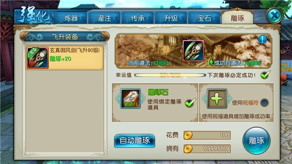 3、每次成功雕琢可提升装备雕琢等级1级,雕琢等级上限为60级。