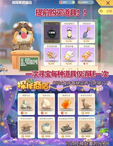 通过挖宝赚取的积分可以在探秘商店兑换各种优质化石碎片!直接获得的恐龙化石碎片也可以囤着,凑齐后可以兑换化石雕塑!