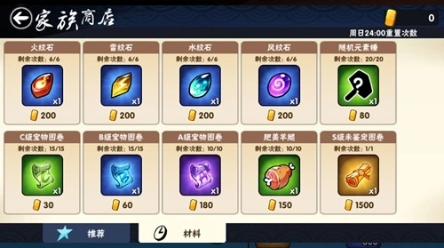 忍阶达到中忍即可解锁家族,通过参与家族boss,家族战,家族副本,家族祈福等途径可以获得家族币,使用家族币可以在家族商店中获取不同种类的资源
