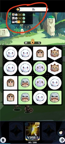 接下来我再召唤出一只龙,具体情况如下:能看到中间的数字比之前多了1,而且能量条也填充了一半——这个增加的1,就是当战场伙伴数量达到上限后,继续消除所累积的形态值。此刻上方显示的总形态值是16。