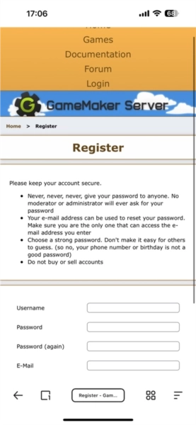 3、按照紫色方框内提供的网址,在浏览器中输入以下地址:gamemakerserver.com/en/register。