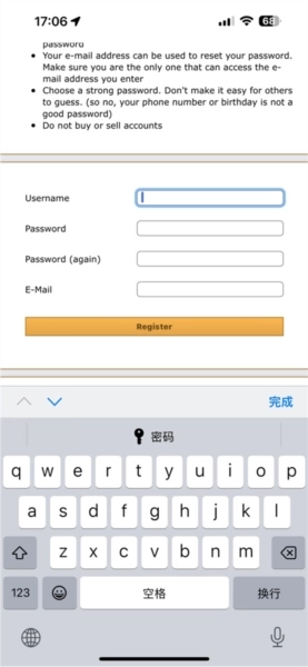 5、请按顺序填写用户名、密码、确认密码以及邮箱地址(邮箱可随意填写)。填好所有信息后,点击下方的注册按钮。若页面显示绿色提示,则表示注册成功;若显示红色提示,则说明注册失败。要是注册失败了,只需重复前面的步骤再试一次就行。