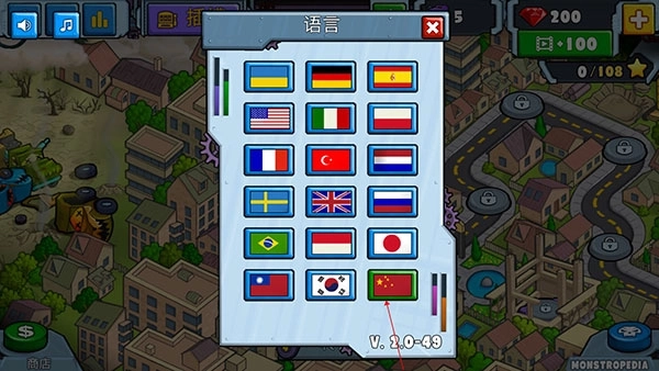 3、进入后,找到中国国旗并选择它,游戏界面就会切换为中文界面。
