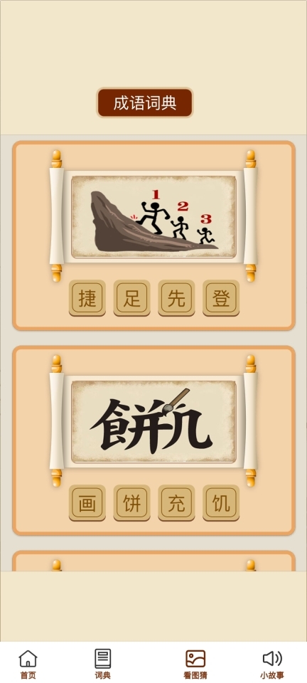 1.玩家需依据成语含义来推测对应的成语,这一猜测过程对玩家的成语知识储备是不小的考验。