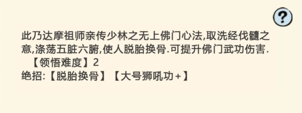 简介:这是达摩祖师亲自传授给少林的至高佛门心法,蕴含洗经伐髓的奥义,能涤净五脏六腑,让人实现脱胎换骨的蜕变,还可增强佛门武功的伤害力。
