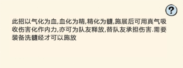 「回春」:可恢复少量生命值,其恢复量会随着[洗髓经]等级的提升而增加。