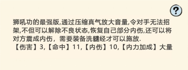 【大号狮吼功强化版】:这是一种远程的带伤害辅助类绝招,伤害处于普通水平。施展时不需要进行内力比拼,释放后能够清除自身身上的大部分负面状态,以及敌方身上可以被驱散的正面状态;同时还会给敌方施加负面状态“颤抖”,并且为自身附加持续2回合的“回春”效果,借助该效果可以恢复内伤,还能补充少量的生命值。