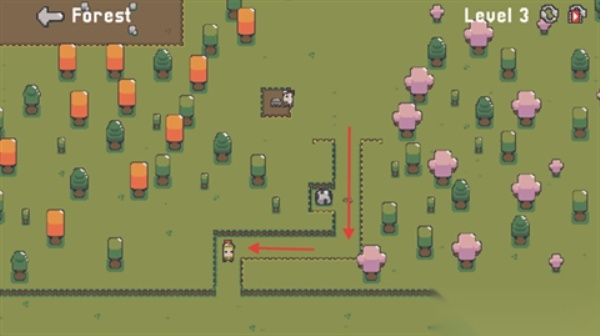 3. 进入【Level3】关卡后,移动到箭头所指的棕色区域来触发机关,以此移动方框内的石头,确保道路没有阻碍。