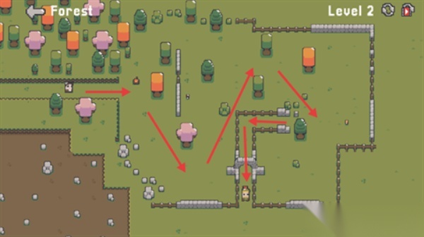 2. 进入【Level2】后,跟着箭头的指引穿过树林与石墙区域,途中会经过火焰和树木,一直朝着目标所在的方向行进。