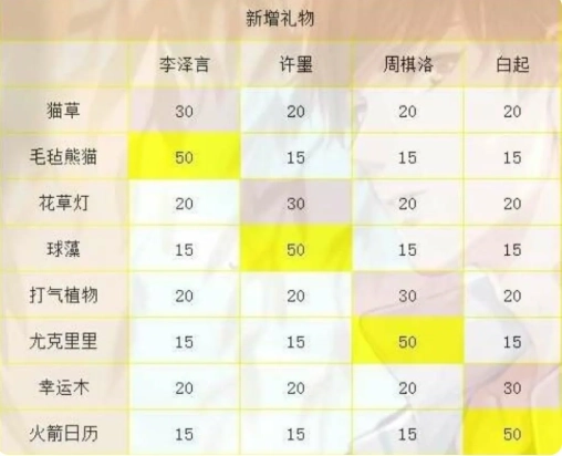 这张图展示的是李泽言、许墨、白起与周棋洛四位男主的小屋礼物好感度对应表。如果把特别礼物送给对应的男主,就能提升更多好感度。而好感度标注为5的礼物,是男主最不喜欢的,赠送这类礼物会扣除心情值。要是持续赠送这类礼物,还能达成“一不小心让男主郁闷”的成就。