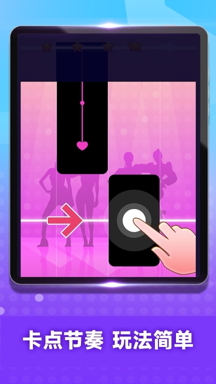 1、采用清新简约画面风格打造的音乐节奏游戏,通过指尖点击,让你沉浸于音乐世界之中。