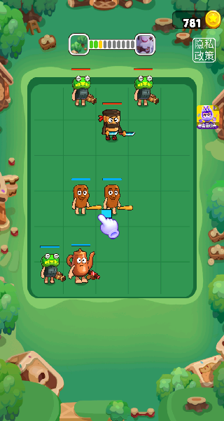 1、操控初始角色木棍人和轮胎青蛙,通过合成相同角色完成进化,增强战力。