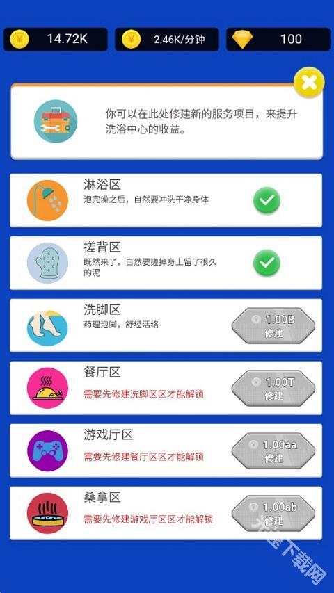 随着玩家资金的不断积累,你还可以建设搓背区、桑拿区、餐厅区、按摩区、街机区等各种各样的服务项目。