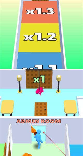 2、闯关时会遇到标有不同倍数的区域,以及类似管理室的场景,需要操控角色在这些区域内行动,去处理出现的各类元素。