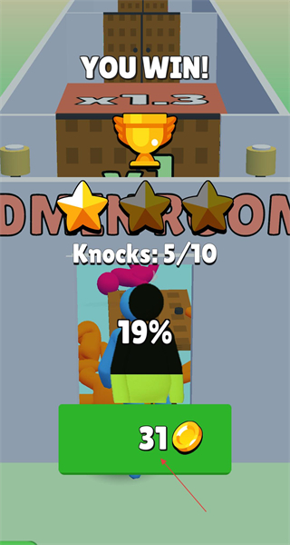 3、顺利通过关卡后,会进入胜利界面,该界面会显示“你赢了”,同时呈现星星评价、敲击次数以及获得的金币数量,可在此查看奖励相关信息。