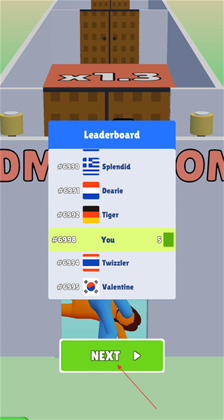 4、查看完奖励后,进入排行榜界面,界面会展示不同玩家的排名情况,找到自己的排名位置后,点击下一个按钮,准备开启下一关。