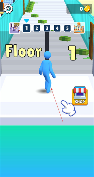 1、启动恶作剧奔跑,进入第一关的界面,这里能看到蓝色小人、楼层标识以及商店按钮,接着操控蓝色小人在楼层之间移动,为闯关做好准备。