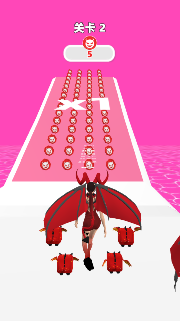 1、在粉色恶魔路、蓝色天使桥等不同主题的关卡中,进行跑酷收集与躲避障碍的操作。