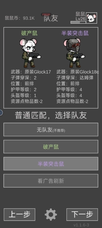 5、队友选择我们的前排突击鼠,最好选择紫色以上。如果没有心仪的队友鼠可以退到选择难度界面再进去,就可以不用看广告刷新队友鼠,不过这样基本刷不出高级队友,如果你的招募处等级不高的话。