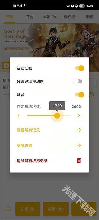 3、在设置页面,可以调整动画、静音和祈愿次数等。
