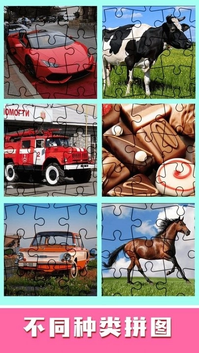 1、打开游戏后,先在众多拼图图案里选择想拼的类型,不管是动物、汽车还是其他物品,选好后进入对应拼图界面。