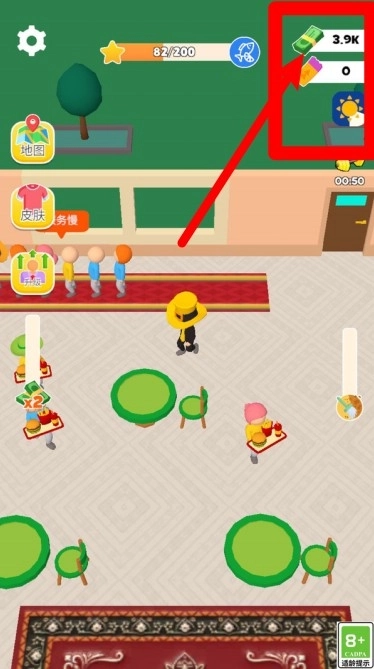 1.货币显示清晰:画面右上角清楚显示当前金币与钞票数量,方便玩家随时掌握经营收入与升级所需的资源状况。