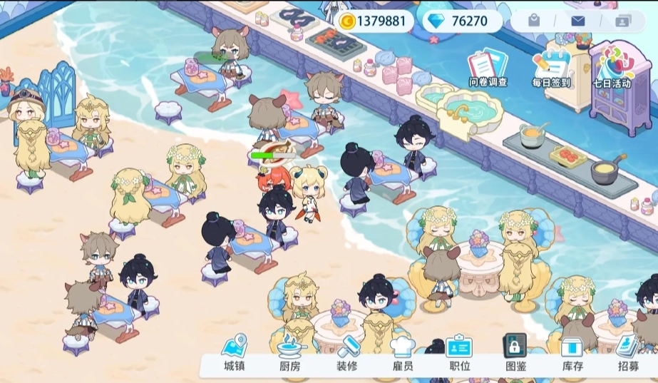 玩法有pvppve,委托刷经验钱换好感度礼物派员工外出寻找食材,在商业街购买装饰或杂物和食材,这个菜谱研发大大的点赞,终于不是等时间赌成功率,非常的有参与感。除此之外就是正常的餐厅经营