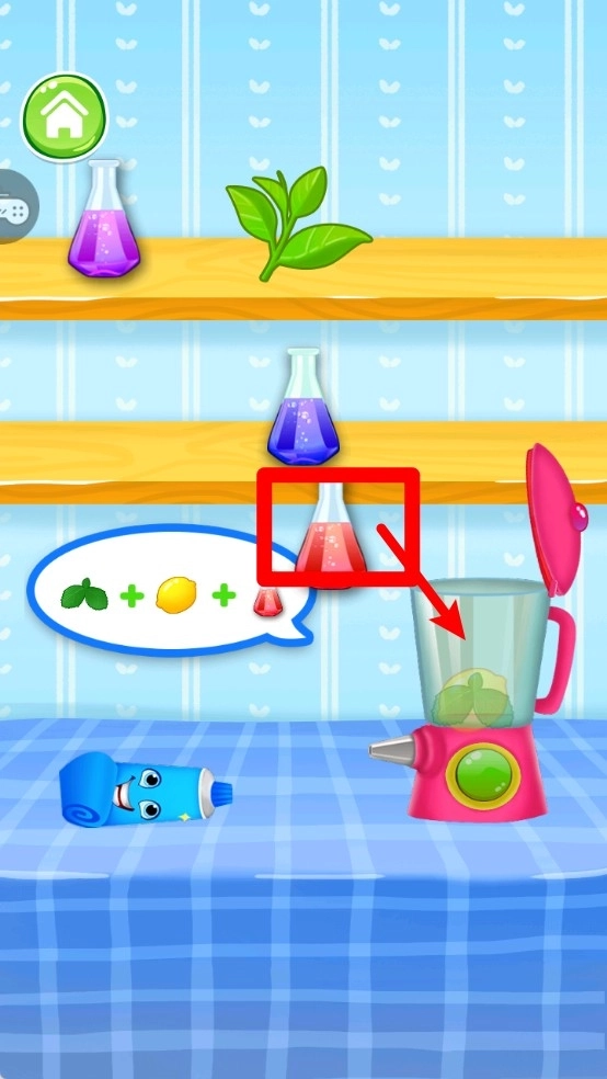 2.按照提示投放材料:根据泡泡提示将薄荷、柠檬和试剂依序放入搅拌机中,配制专属牙膏配方,步骤简单清楚又直观。