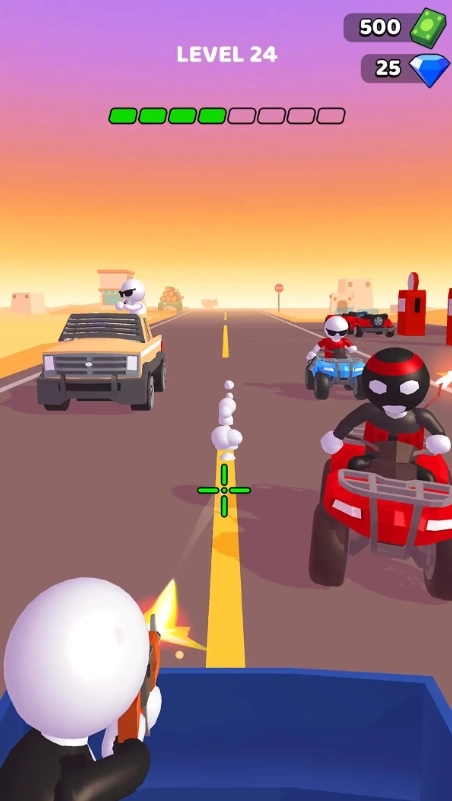2、战斗过程可对敌人进行射击---头部、车轮等,敌人以车辆为单位出现(1-4人/车),击打司机、车轮都可直接淘汰该车辆。