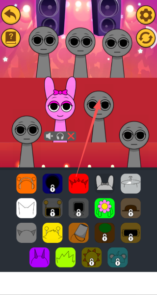 4、点击每个角色下方的音效按钮,能够实时调整乐器配置,借助组合不同音色来创作个性化的音乐片段。